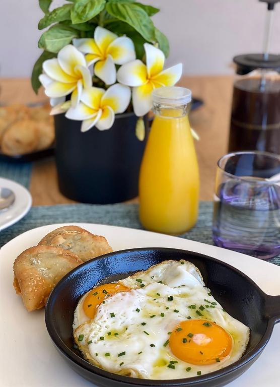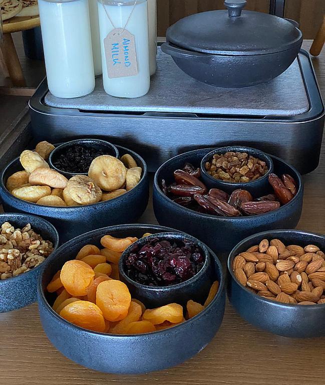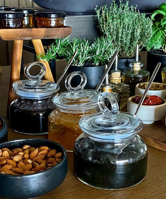 Az étterem görög, nemzetközi és európai ételeket szolgál fel, vegán és gluténmentes opciókkal. A reggeli helyi specialitásokat, friss péksüteményeket és egyebeket tartalmaz.